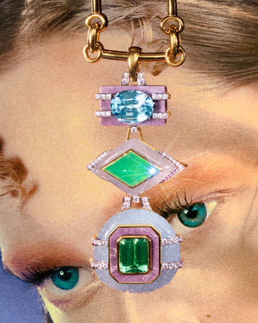 A racing locomotive, a sleek automobile, or a gleaming ocean liner are all synonymous with the Streamline aesthetic. Made with opaque curving hard stones and geometric straps of diamonds, the Streamline Collection evokes speed and propulsion toward the future.